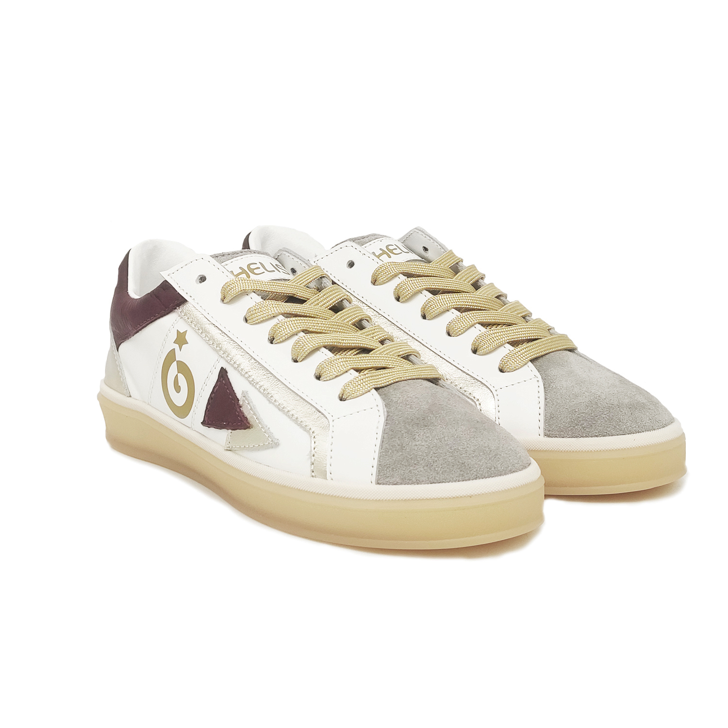 Sneakers in pelle di vitello colore bianco con inserti in camoscio colore grigio , pelle vinaccia e laminato col. oro.