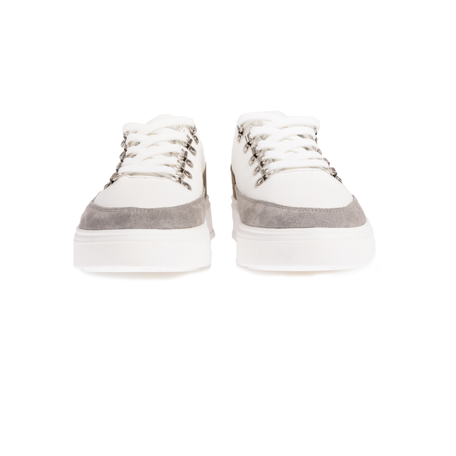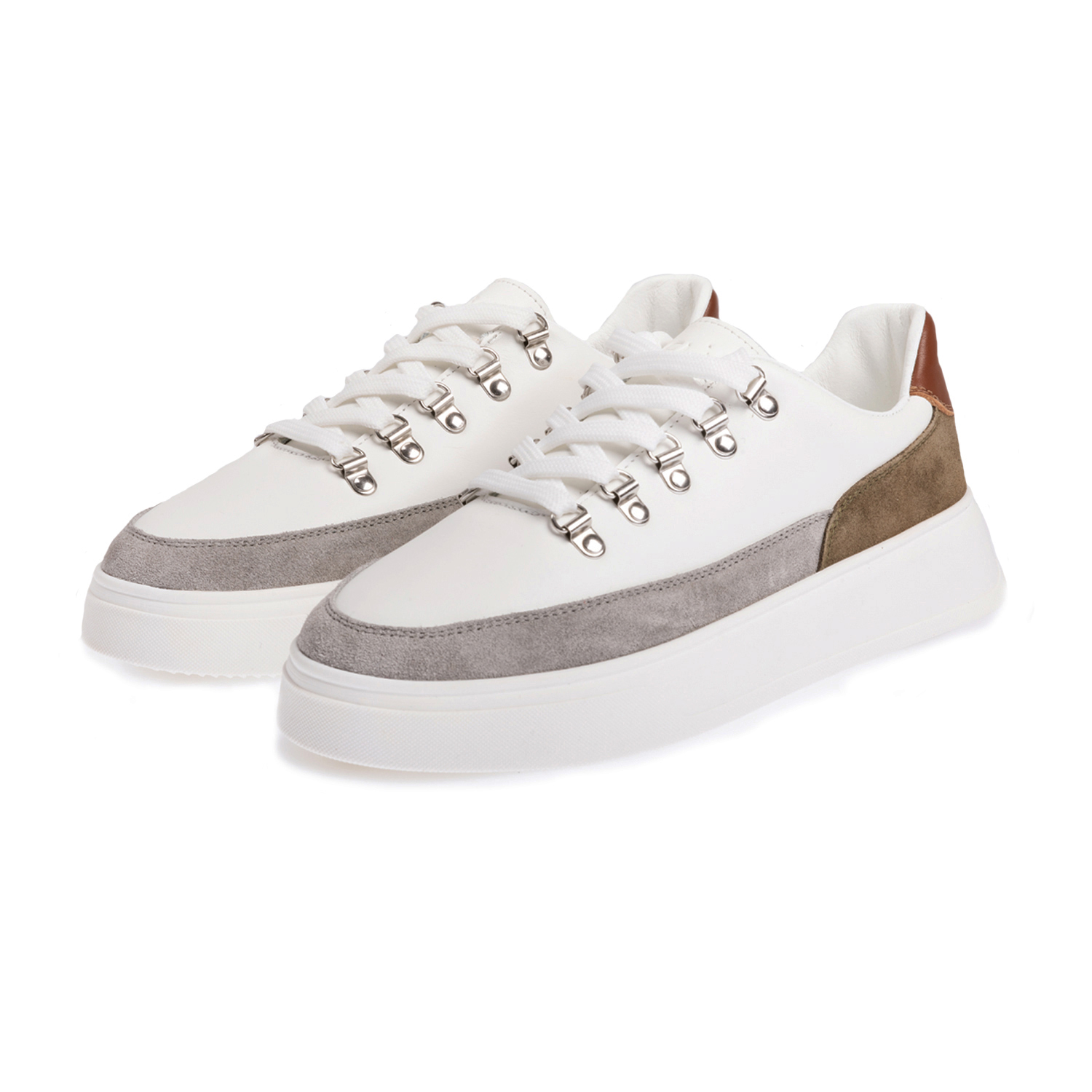 Sneakers in pelle di vitello colore bianco con inserti in pelle scamosciata grigio medio, militare e pelle cuoio