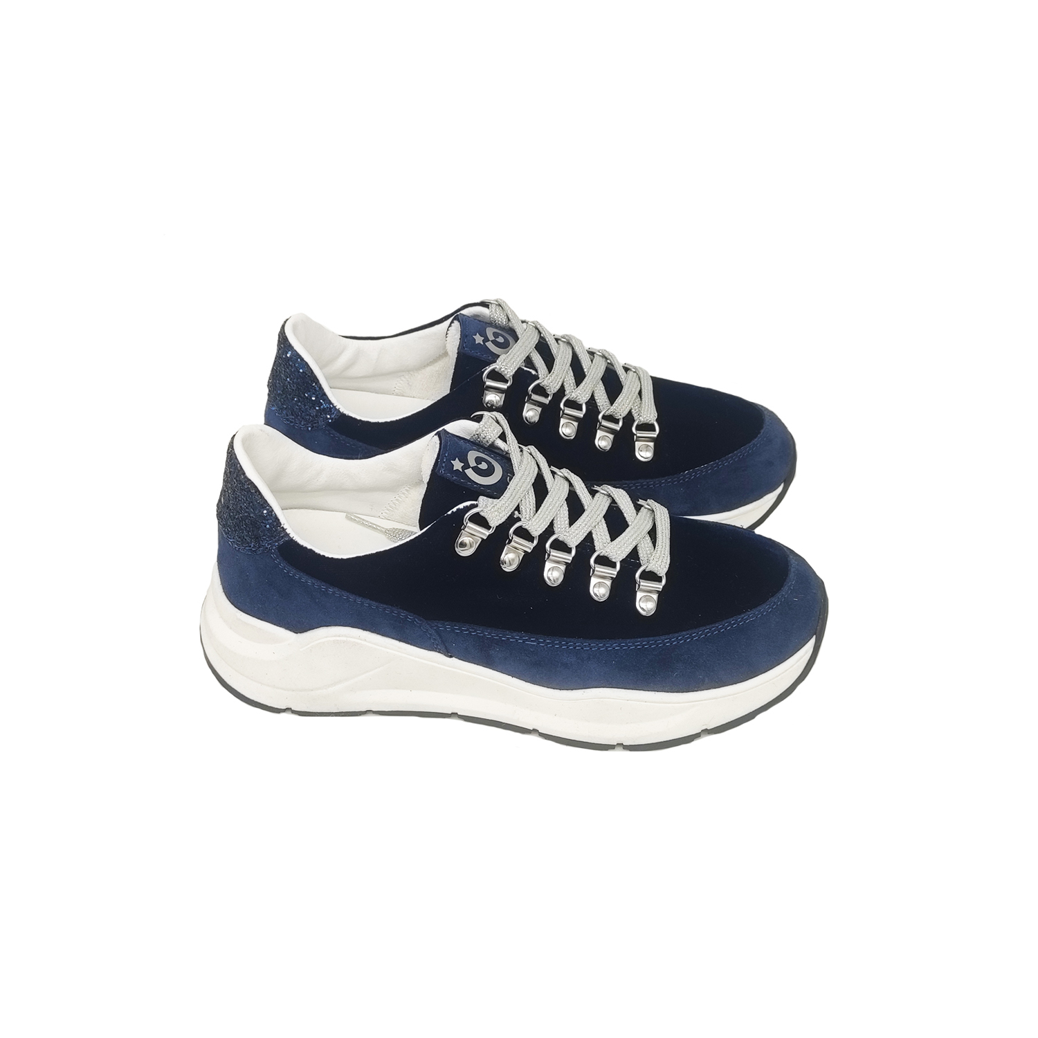 Sneakers in tessuto velluto colore blue con inserti in pelle scamosciata col. blue e glitter col. blue.